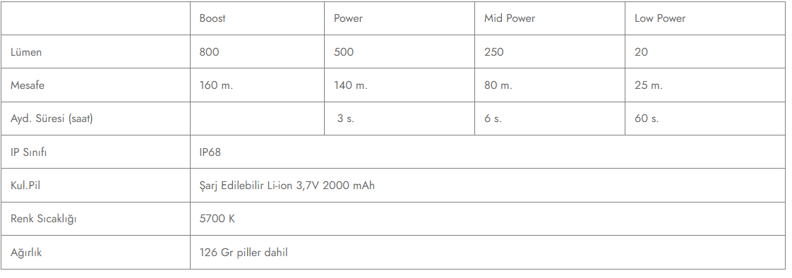 Üç parlaklık seviyesine ve kırmızı ön ışığa sahip, şarj edilebilirdir.