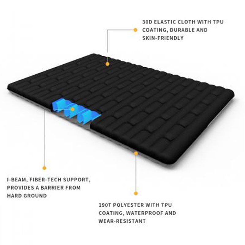 - TPU kaplamalı 190T polyester ve 30D elastik kumaştan üretilen bu yatak, su geçirmez, delinme ve gerilmeye karşı dayanıklı, çevre dostu ve uzun yıllar kullanıma dayanıklıdır.