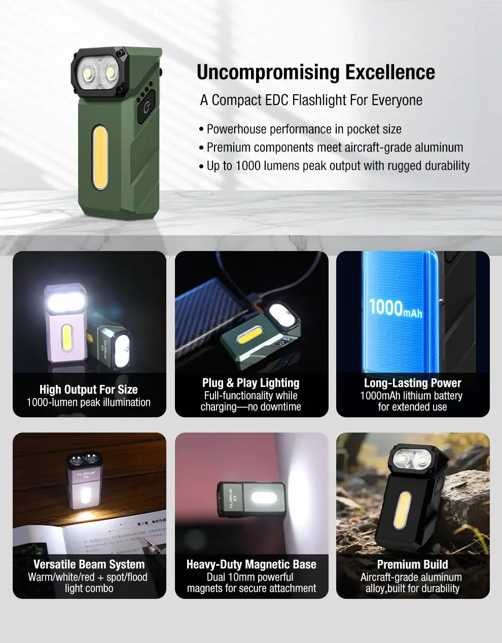 - Güçlü Mıknatıs ve Hafif Yapı: Güçlü mıknatısı sayesinde metal yüzeylerde ellerinizi kullanmadan tutabilirsiniz. Çizilmeye karşı dayanıklı kaplamalı, sağlam uçak sınıfı alüminyumdan üretilmiştir; dayanıklı ancak hafiftir (sadece 88,5 g). İş, seyahat ve günlük kullanım için mükemmel bir EDC el feneri.