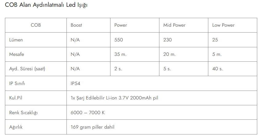 - Beyaz ışıklı (üç karartma seviyesi) ve kırmızı ışıklı (sabit veya yanıp sönen) COB projektör LED’i